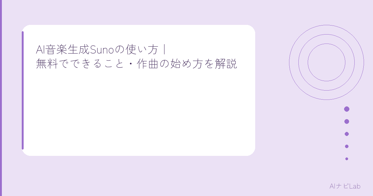 先に結論です。Sunoは、テキストで指示するだけでプロ級の楽曲を自動生成してくれるAIツールです。しかも無料プランでも毎日数曲作れます。公式サイトはSuno AI公式サイトです。